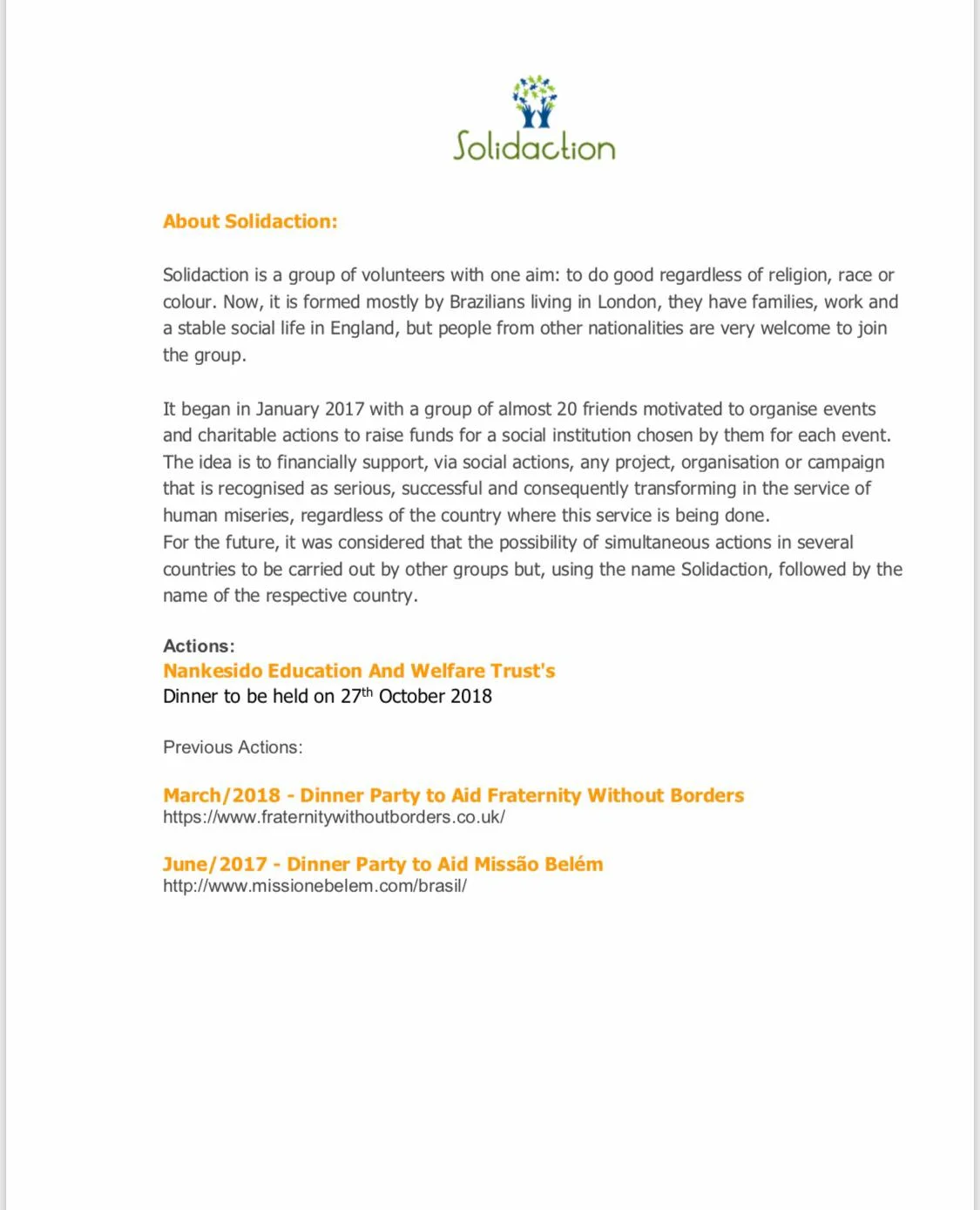 No próximo mês o grupo de voluntários de brasileiros no Reino Unido SOLIDACTION está organizando uma feijoada para o dia 13 de abril de 2019. O SolidAction existe deste 2017, é formado por brasileiros que vivem em Londres, onde tem suas famílias, trabalho e uma vida social estável. O grupo promove 2 vezes ao ano açōes para angariar fundos e repassá-los para comunidades carentes, principalmente aquelas baseadas no Brasil. Todas as açōes são feitas através de doaçōes e o grupo tem alcançado excelente divulgação, aceitação e importância como campanha solidária.